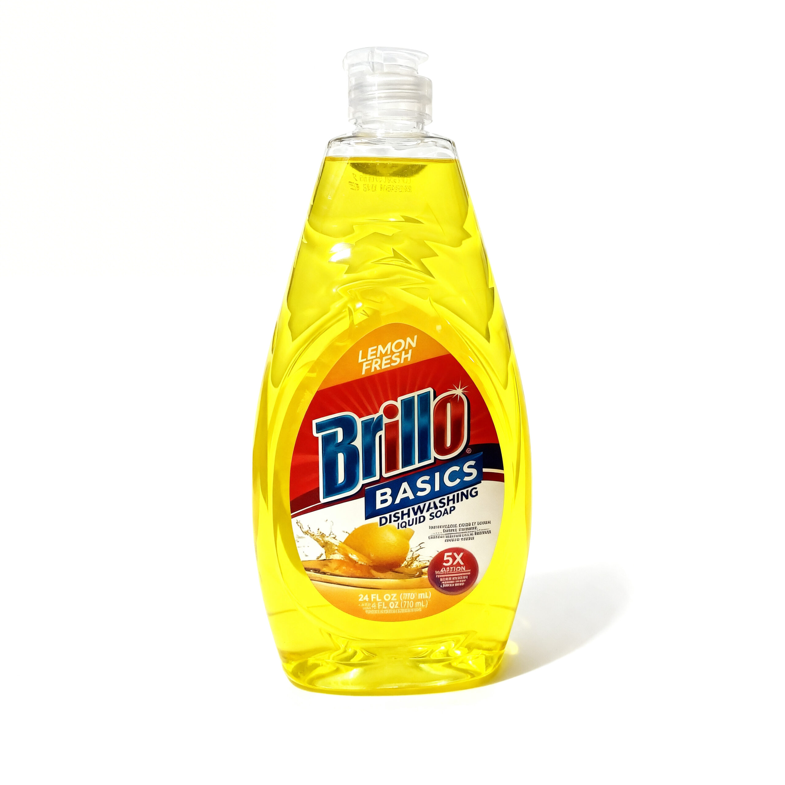 [DISH SOAP] Brillo Basics liquid dishwashing detergent with grease-cutting formula for effective hand washing of dishes, pots, and kitchen utensils. • Liquid dishwashing detergent • 24 oz bottle • Lemon fresh scent • Cuts through grease and baked-on food • Gentle on hands • Ideal for commercial kitchens, break rooms, and janitorial use